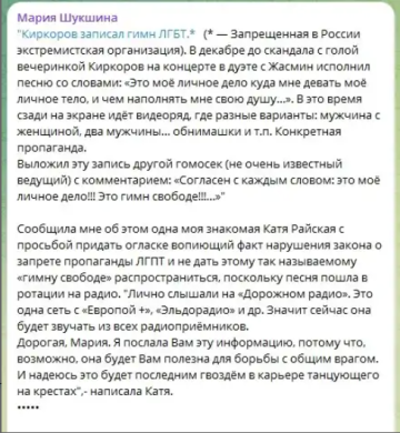 Впрочем, Газманов все же не первый, кто высказал подобное мнение. Та на днях заслуженная артистка РФ Мария Шукшина в своем Telegram-канале прямо обвинила певца Филиппа Киркорова в пропаганде ЛГБТ*.