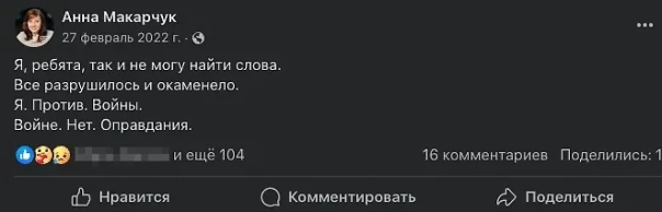 — Я, ребята, так и не могу найти слова. Всё разрушилось и окаменело. Я. Против. Войны. Войне. Нет. Оправдания! — вскоре она разместила и такой пост.