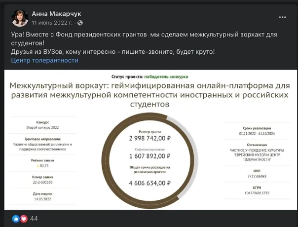 Несмотря на позицию Анны Макарчук, Центр толерантности получает на свои проекты гранты на миллионы рублей.
