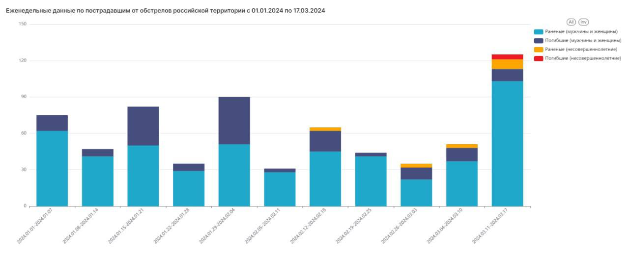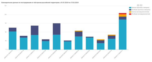 Всего по гражданским объектам на российских территориях за неделю нацистами было выпущено не менее 2300 боеприпасов различных калибров. От их действия пострадали не менее 138 мирных жителей: 17 человек погибли, в их числе 4 несовершеннолетних ребенка, ранены 121, в том числе 8 несовершеннолетних детей.