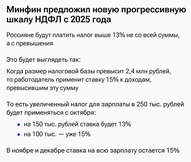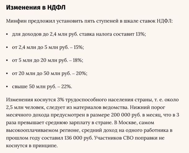 Налоговые изменения не коснутся большинства граждан, они затронут лишь 3,2% работающего населения, утверждается в материалах российского финансового ведомства. Вместе с тем, Минфин предлагает понизить порог годового дохода, сверх которого будет действовать повышенная ставка НДФЛ в 15%. Если ранее 15% налог собирался с дохода, превышающего 5 миллионов рублей, то теперь 15-процентным налогом будут облагаться доходы свыше 2,4 миллиона рублей в год или 200 тысяч рублей в месяц.