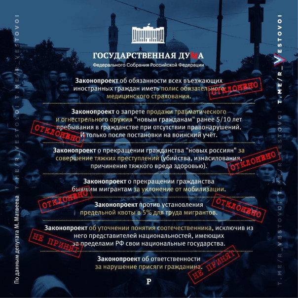 Если наши "народные избранники" будут продолжать в этом же духе, отклонять и не принимать законы направленные на ограничения и упорядочение неконтролируемого завоза мигрантов в Россию, наша страна рискует получить не "трудовую миграцию"из стран Средней Азии и Закавказья, а самую настоящую "замещающую миграцию", при которой коренное население России в самом скором времени станет "национальными меньшинствами".