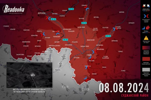 Вчера, 7 августа, главным событием дня стали бои с прорвавшимися через границу РФ в Суджанском районе Курской области подразделениями ВСУ, противник уже выбит из села Новоивановка. Русские войска вышли на северные окраины пгт Нью-Йорк по западному берегу Кривого Торца, гарнизон ВСУ оказался на грани окружения. Источник
