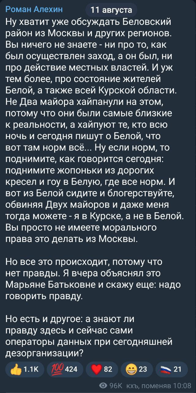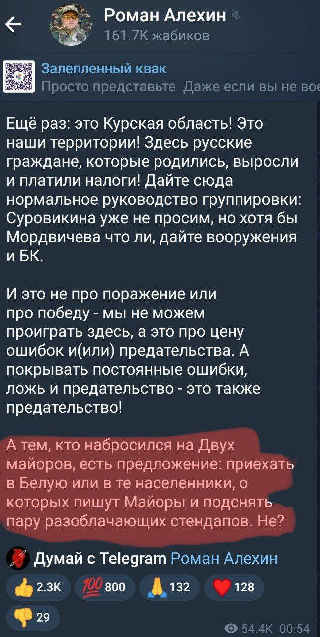 И знаете таки шо самое смешное во всём этом? В главном-то они правы: действительно тут наличествуют и происки Киева, и ЦИПСы в том числе. Действительно, только ведь ципсятина могла по приказу из Киева придумать вбросы в наше информпространство про сдачи н.п. и целых районов, чтобы, как в случае с Курской областью, где эвакуировалось по подсчётам на пятницу порядка 76 тысяч человек. При том что в угрожаемом районе живёт не более 40 тысяч. А что это значит? Пробки, паника, заторы в том числе и для встречных военных колонн, а главное все выезды это куда большая угроза для жизни граждан, чем даже обстрелы: от оных можно и спрятаться всё же, а вот наткнуться в машине на ДРГ, как показывает практика, тут уже шансов мало будет выжить.