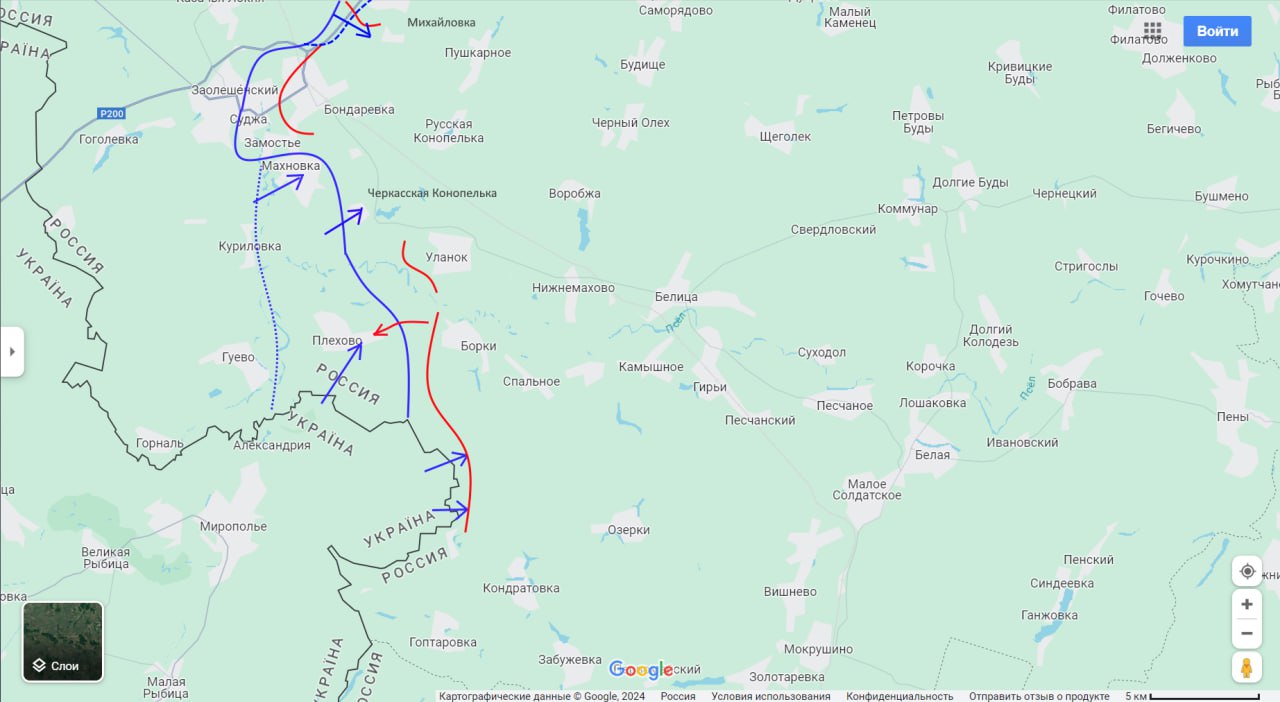 Как и южная. Нам не удалось вчера выдавить противника из Плёхово, и сегодня утром ВСУ пытаются своими ДРГ щупать наши позиции в районе сел Черкасская Конопелька и Русская Конопелька. Если противнику удастся их занять, это закроет кольцо окружения вокруг Суджи.
