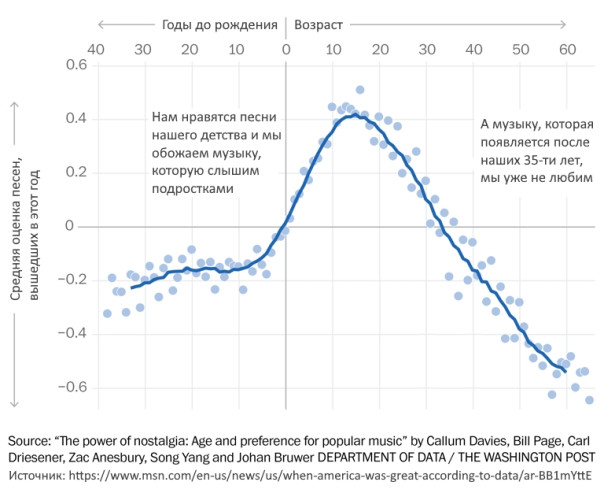 Снова перенесёмся в наши дни. Недавно американцы провели исследование, опросив кучу своих соотечественников на тему «когда было лучше» (ссылка). Короткий итог — люди склонны считать, будто в их детстве и молодости были самые лучше времена со всех точек зрения. И экономика тогда была лучше, и журналисты честнее, и мода адекватнее… в общем, золотой век всего. Особенно ярко эта трогательная ностальгическая пристрастность проявилась при обсуждении музыки.