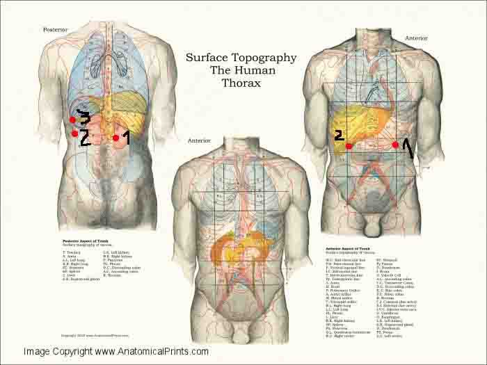 Входное отверстие под цифрой 1 находится с правой границы проекции поясничного позвонка 2. Входные отверстия 2 и 3 расположены по задней подмышечной линии в пересечении с 9 и 11 ребрами.