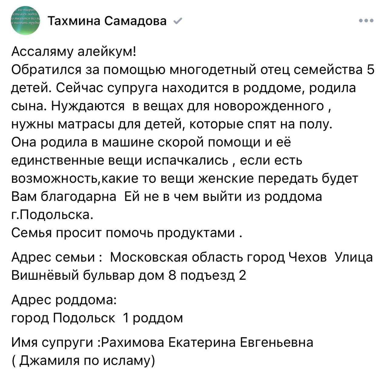 П.С. Судя по соцсетям у Тахмины Самадовой в Москве вполне себе успешный бизнес (!!!). То есть люди они не обездоленные и вполне себе обеспеченные. Источник