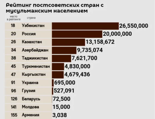 Собственно, обо всем говорит статистика – в 2022 году Россия впервые вошла в ТОП-20 стран мира по количеству проживающих в стране мусульман, на тот момент в стране их было 20 миллионов. При этом в 2019 году количество мусульман в России оценивалось в 14-15 миллионов человек. Если говорить о рейтинге, учитывающем только постсоветские страны, то здесь Россия находится на почетном втором месте, сразу после Узбекистана.