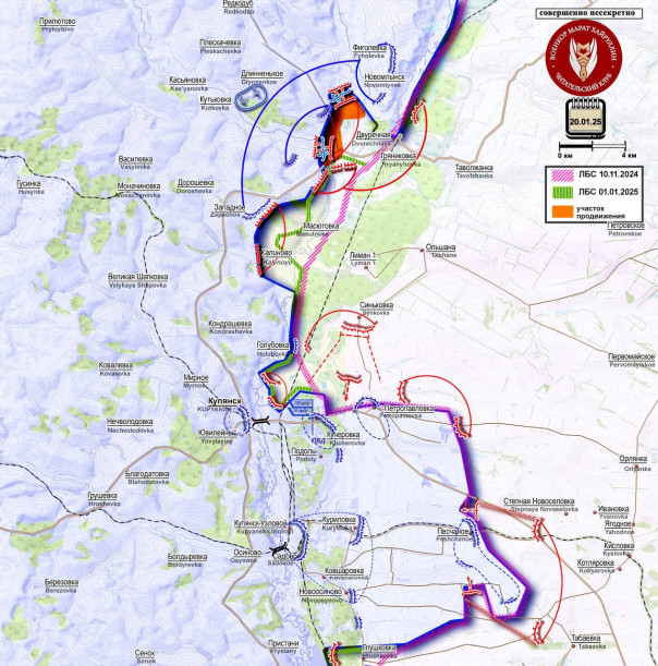 На Купянском направлении ВС РФ продвинулись в н.п. Двуречная. В первой декаде января российские силы расширили контроль и зашли в северную часть населённого пункта. На данный момент в ходе боёв наши военные установили контроль над северо-восточной частью Двуречной, при этом значительно расширив зону боёв и в южной и в северной частях населённого пункта.