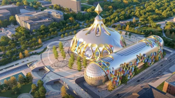 Проект нового здания вымазали в дегте, вываляли в перьях и погнали топить в Москве-реке. Я смотрю на эту картинку и реально не понимаю, из-за чего сыр-бор. Веселенькое здание в форме циркового шатра, какие-то блесточки, много золота, какая-то загадочная серебряная труба рядом. Ну цирк и цирк, детишкам понравится.