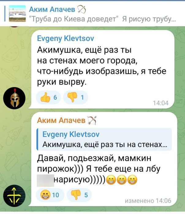 Когда от жителей, которые не могут без слез смотреть на разрушенные, а теперь еще и исписанные матом стены, начала поступать справедливая возмущенная реакция, идет хамский ответ: «Кому не нравится, приезжайте и закрашивайте». Более того – в комментариях позволяет себе забивать «стрелки» женщинам!