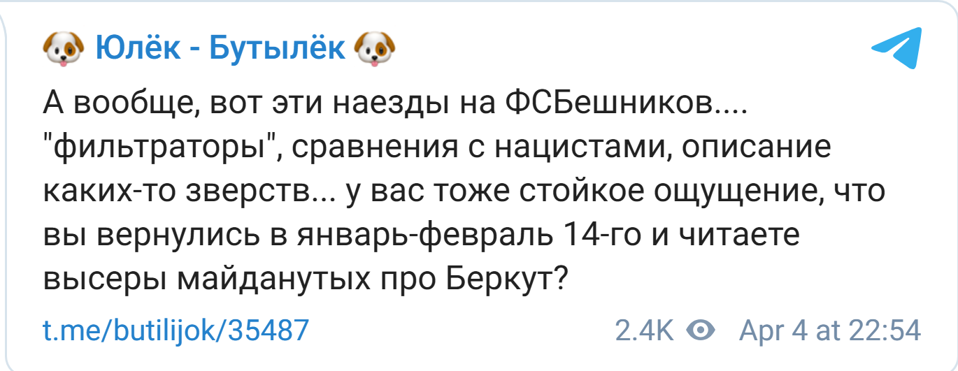 Разве не с того началось, что вы все: кофманы, монтяны, евичи, грубники, катакомберы, царёвы, пiхвы, нестреляйченки, коты, васильцы, чаленки, подоляки, онуфриенки, долгаревы, крысобелки, апачевы и многие-многие другие южнорусские пассионарии - заехали в Россию и первым же делом принялись со всех информплощадок поливать дерьмом всех и вся?