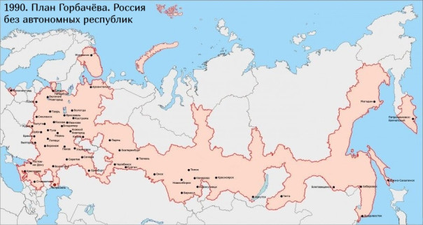 Если бы Горбачёв довёл свой план до конца, то в момент распада СССР все эти республики могли бы выйти из состава России. Может быть, некоторые автономии остались бы в нашем составе, так как сепаратизм успел созреть далеко не везде… однако опыт распада СССР заставляет предположить худшее — в 1991 году право на независимость обналичили все, даже Белорусская ССР. После отделения автономных республик Россия потеряла бы 51% территории и около 20 млн человек. Достаточно беглого взгляда на карту, чтобы заметить, какие богатые тут открываются возможности для розжига гражданских войн, для политических интриг, для экономического саботажа и для выкручивания рук маленькой России, у которой остаётся вдвое меньше природных ресурсов, и территория которой со старта разрезана на несколько крупных кусков.