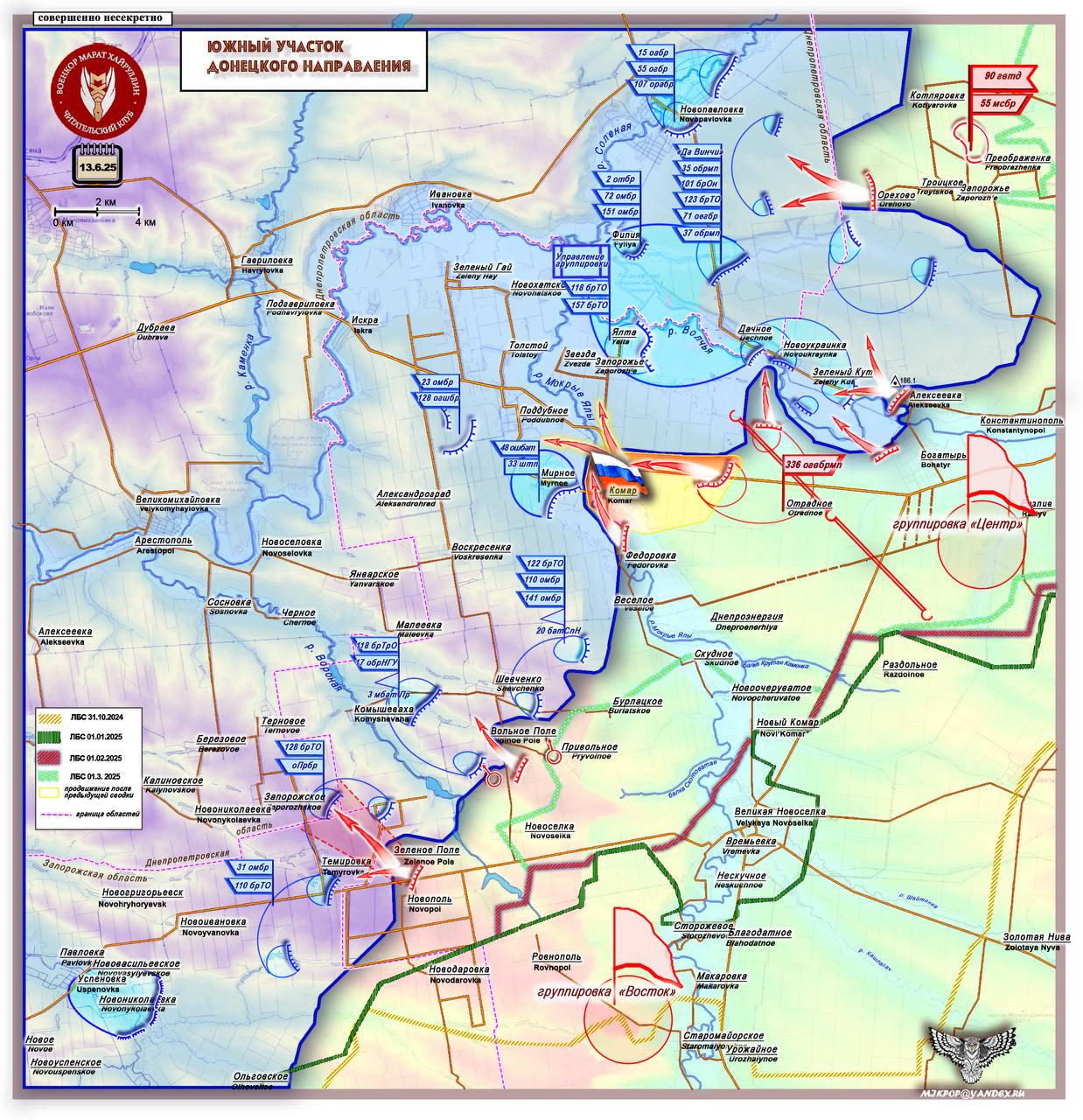 Эти направления сковывают тактические резервы противника и обеспечивают основной участок в районе с.Комар. В случае удачного развития возможного успеха силами ВС РФ, мы будем наблюдать образование самостоятельного участка прорыва госграницы и выхода в Днепропетровскую область Украины по хребту водораздела рек Вороная и Янчур . При этом наши прикроют свой правый фланг р. Вороная.
