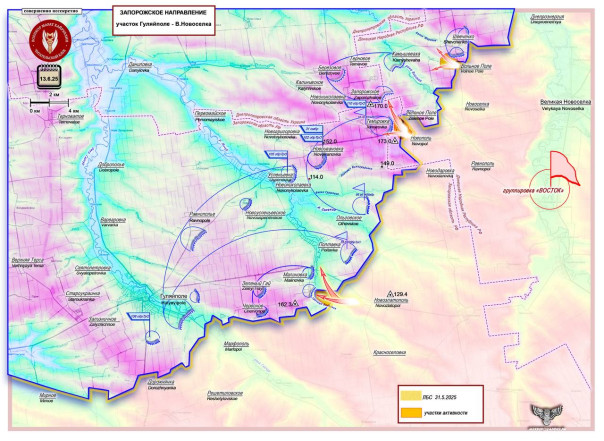 Обеспечивая действия у н.п. Темировка, армия России активизирует Гуляйпольский участок, оказывая давление на ВСУ направлением Новозлатополь - Малиновка. Это соседний водораздел (реки Янчур и Гайчур), расположенный южнее.