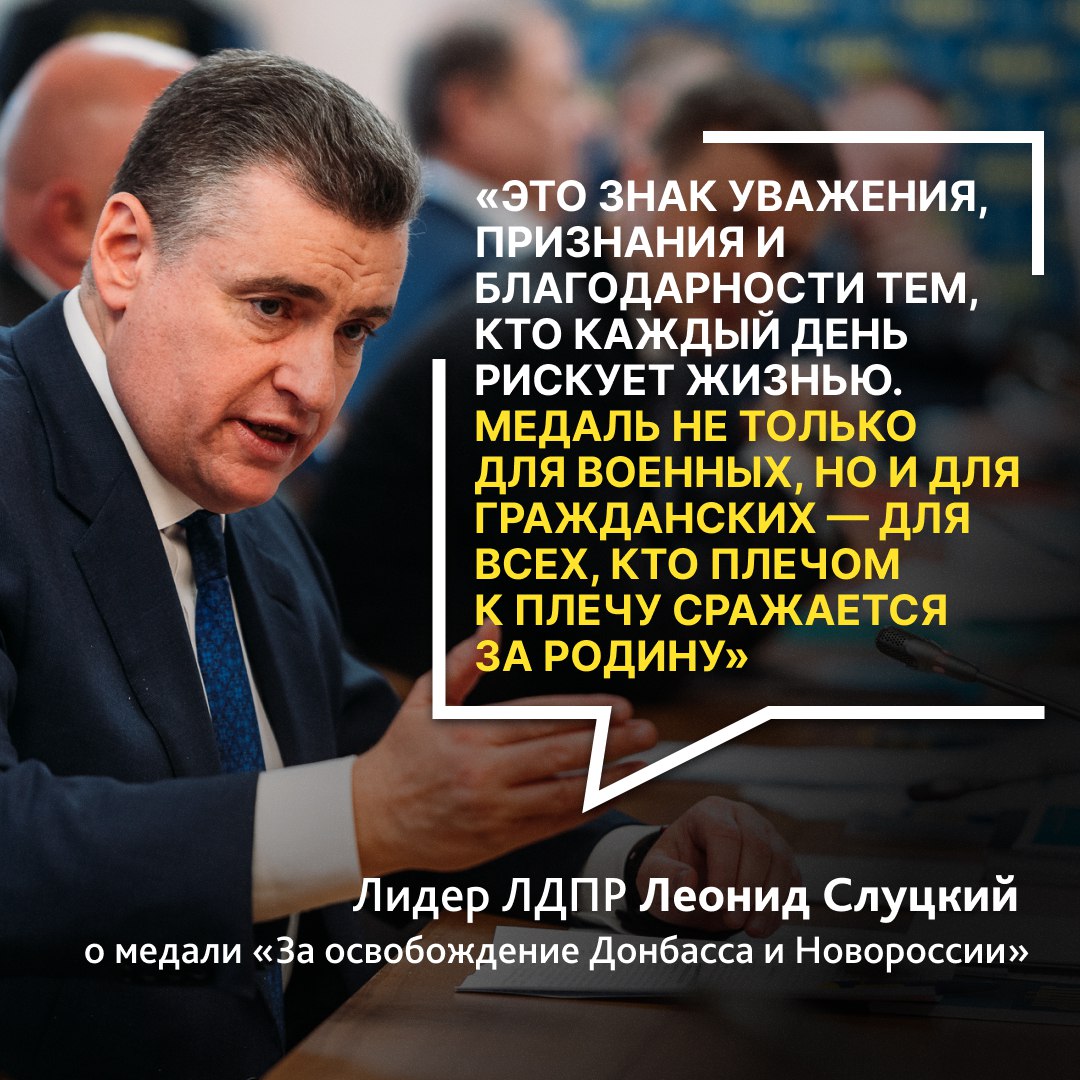 Лидер ЛДПР Леонид Слуцкий заявил, что медаль ЛДПР учреждается в целях поощрения граждан, внесших личный и коллективный вклад в освобождение Донбасса и Новороссии, а также для стимулирования и поддержки народных инициатив по освобождению этих территорий.