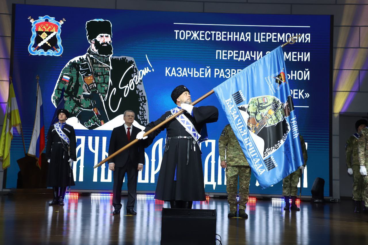 Казачьей разведывательной бригаде «Терек» в торжественной обстановке передали знамя, на котором президент оставил надпись «С Богом»