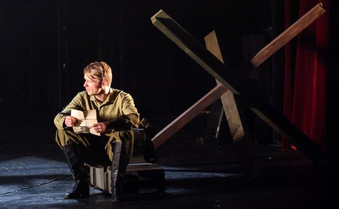 На фото: актер Владимир Андриянов (Он) в спектакле «Неотправленные письма» в постановке режиссера Вячеслава Манучарова на сцене театра им. Моссовета. В основе — одноименный роман Олега Роя о специальной военной операции и событиях на Донбассе