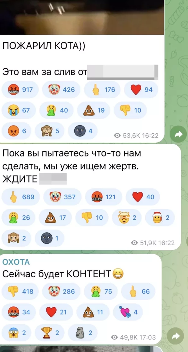 Но то, о чем пишут СМИ, — не фейк. Так, в одном из заблокированных тематических телегам-каналов еще совсем недавно администратор публиковал видео с жестокими расправами над домашними животными, в частности котами. Все это сопровождалось комментариями: "ищу тварь для убийства", "пожарил кота" и прочими в том же духе. Подписчиков — более трех тысяч.