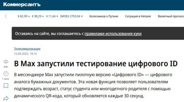 15 сентября Коммерсант: В мессенджере Max запустили пилотную версию «Цифрового ID» — цифрового аналога бумажных документов. Эта новая функция позволяет пользователям подтверждать возраст, статус студента или многодетного родителя с помощью динамического QR-кода, который обновляется каждые 30 секунд.