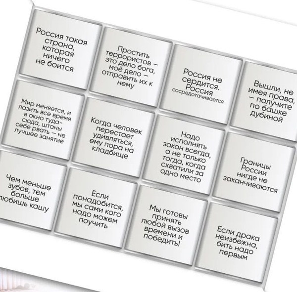 Также он опубликовал фото подарочных конфет. На обертке одной из них написано «Своих не бросаем». На коробке конфет с изображением Путина написано «Великие слова Великого человека» и одна из его цитат: «Вести диалог с Россией с точки зрения силы − бессмысленно».
