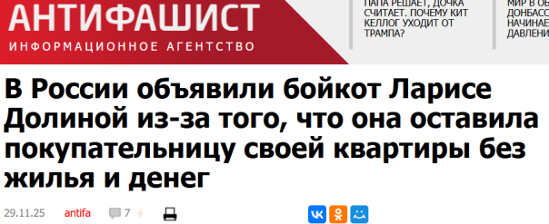 Жители России объявили бойкот Ларисе Долиной в связи с тем, что она продала квартиру, а деньги отдала мошенникам, при этом суды нескольких инстанций вернули ей эту квартиру, а покупательница, мать-одиночка Полина Лурье, осталась без жилья и денег.