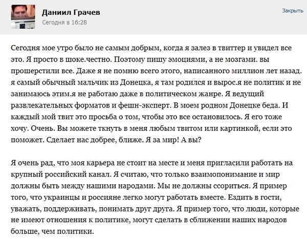 “Вот мой новый рабочий виток - с 30-го марта я буду вести новое развлекательное утреннее шоу "Кофе с молоком" на НТВ. Когда мне поступило это предложение, то я испугался, скажу честно, затем очень долго сомневался. Сразу скажу, проект будет без политики, негатива и жести. Только позитив и мои дурацкие шуточки. Я понимаю, что кто-то меня не поймет и не поддержит. Но я хочу сказать главное - моя работа сейчас тут, а мое сердце в Украине. Я всегда был с вами откровенным, не скрывал своих взглядов, таким и остаюсь. Пусть кто-то со мной и не соглашался”, - написал телеведущий на своей странице “ВКонтакте”. На той же самой странице, где он раньше выкладывал посты характерного содержания.