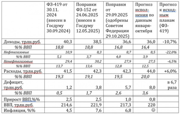 Бюджет был принят в конце ноября 2024 года с ничтожным, неправдоподобным дефицитом в 0,5% ВВП (1,2 трлн руб.). Уже в мае его повысили до 1,7% ВВП (3,8 трлн.), по итогам восьми месяцев превысили и увеличили в сентябре до 2,6% ВВП (5,7 трлн руб.). Тогда же аналитики называли реалистичную величину дефицита по итогам года — не менее 8,0 трлн руб. (3,6% ВВП), и она пока наиболее правдоподобна.