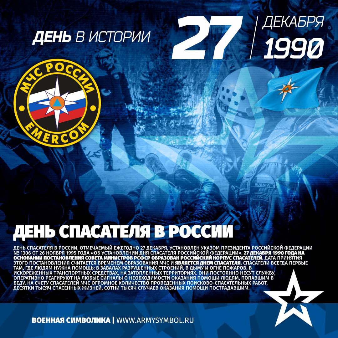 27 декабря 1990 года на основании Постановления Совета Министров РСФСР образован Российский корпус спасателей. Дата принятия этого постановления считается временем образования МЧС и является Днем спасателя.