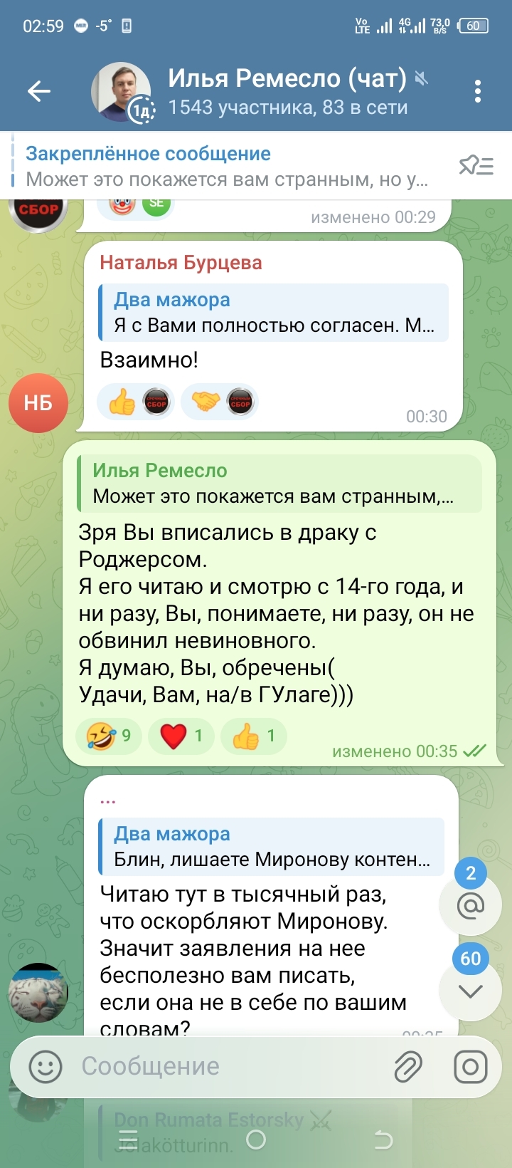 Мне в личку писали, что там некто Миронова высказывала недовольство, что я "поздно включился в драку" (я сам не видел, но мне так сказали - смешная группа "Пятница"),