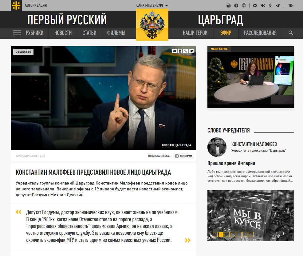 «Учредитель группы компаний Царьград Константин Малофеев представил новое лицо нашего телеканала. Вечерние эфиры с 19 января будет вести известный экономист, депутат Госдумы Михаил Делягин.»