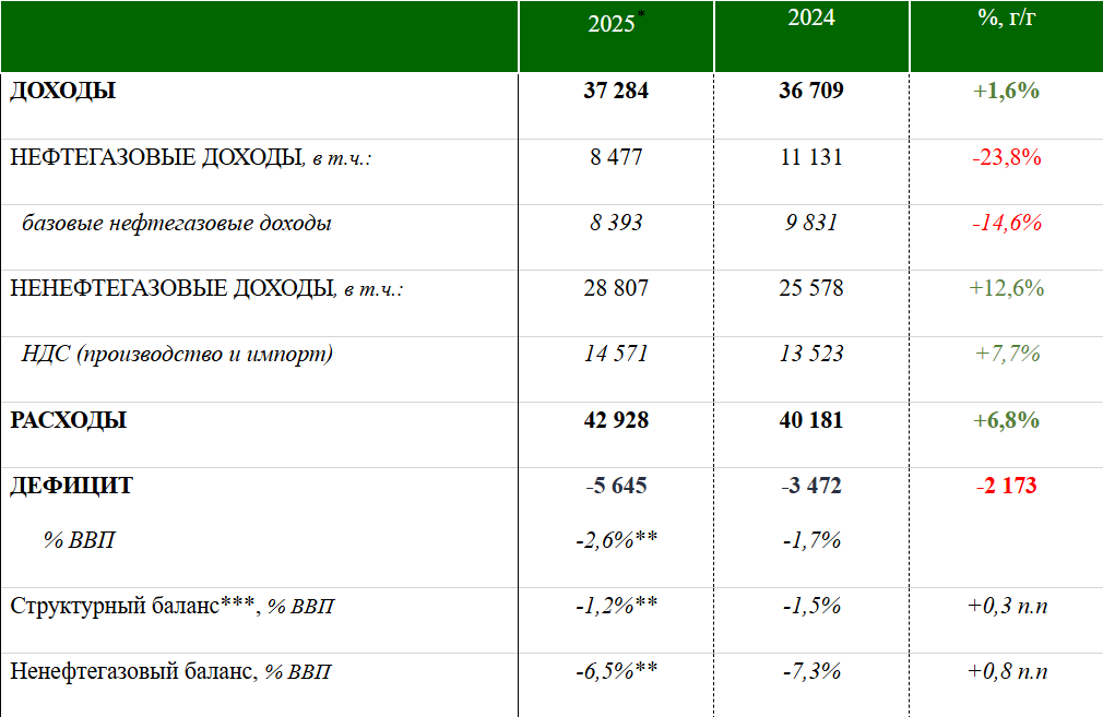 По предварительной оценке, дефицит федерального бюджета в 20251 году сложился в размере порядка 2,6% ВВП, а ненефтегазовый дефицит – в пределах 6,5% ВВП (против 7,3% по итогам 2024 года). В целом федеральный бюджет исполнен в соответствии с целевыми параметрами – первичный структурный дефицит с поправкой на сальдо бюджетных и межгосударственных кредитов в 2025 году составил 1,2% ВВП (в пределах целевых параметров 1,3%).