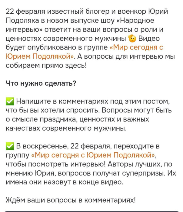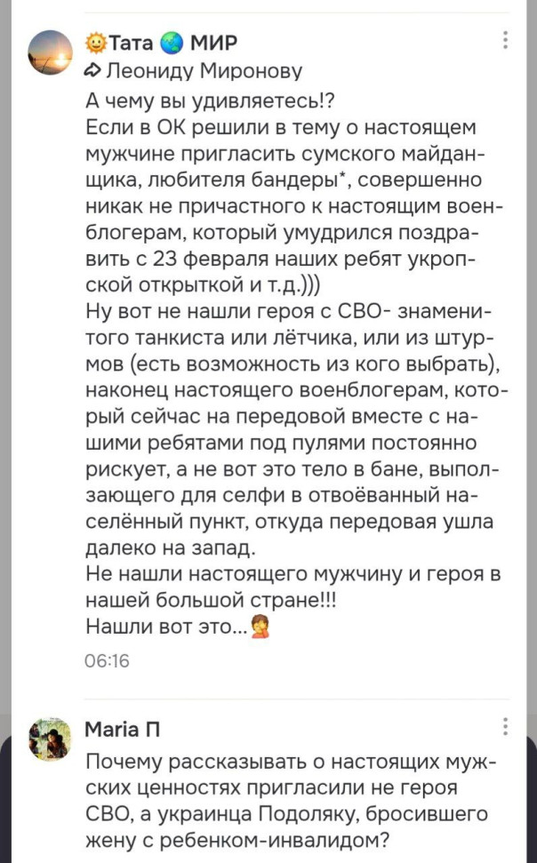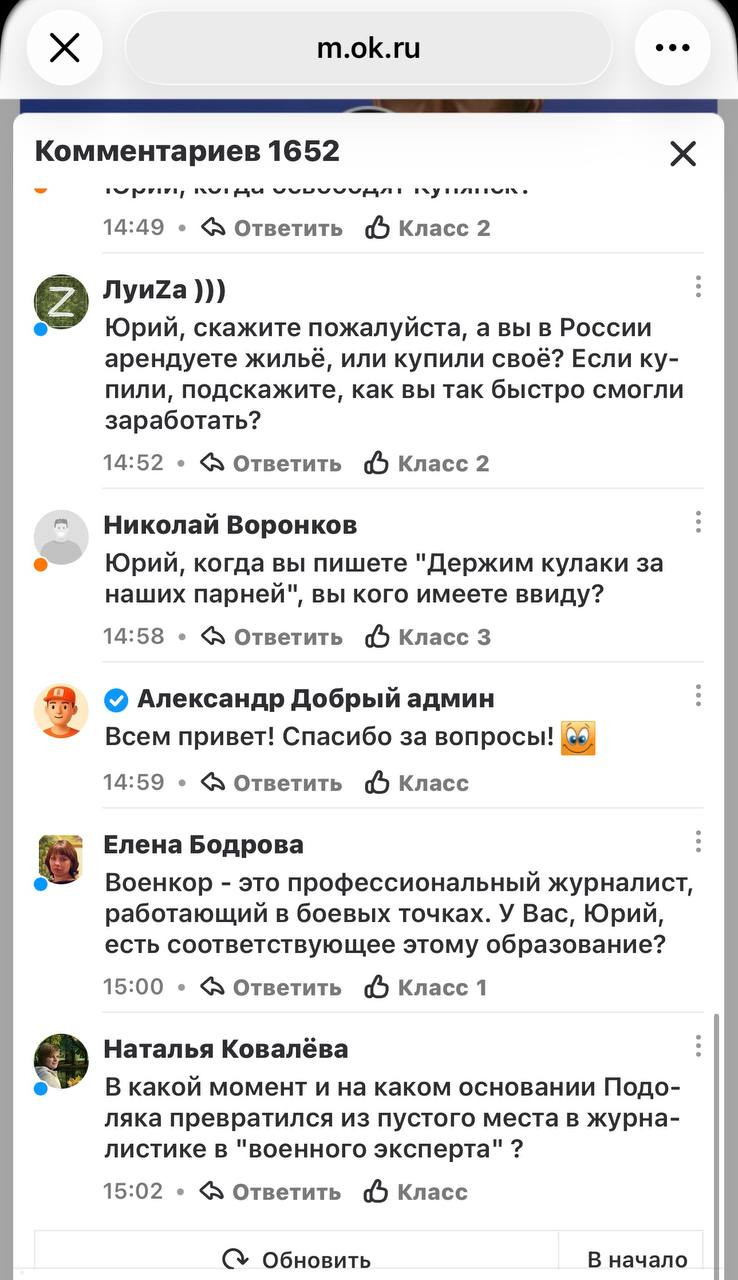 Правда, есть нюанс. Подавляющее большинство вопросов относятся к тому, какого мужского начала Подоляка объявлен "настоящим мужчиной" и "военным экспертом". Несчастные модераторы ОК стирают в кровь пальцы отправляя в бан тех, кто последовал их же собственному предложению задать вопрос. Есть подозрение, что Подоляке не на что будет отвечать, так как вопросы будут тщательно удалены - Юрий Иванович, как и положено клиническому свидомому украинцу, пораженному вирусом "украинства", настолько труслив, что предпочтет слиться с проекта вообще и объявить себя "затравленным проукраинской сеточкой" (как уже делал не раз).