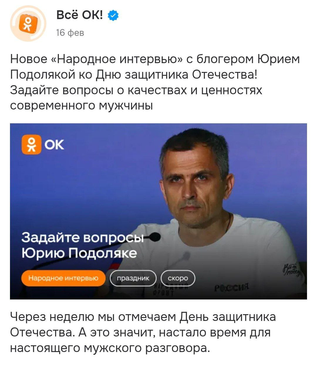 Но вернемся к необъяснимо уважаемому Юрию Ивановичу, который за четыре года СВО прослыл и паникером, и лжецом, и фейкометом, и защитником осужденного ныне генерала Попова, и сборщиком денег на лодки, которых никто так и не увидел. Эти и другие вопросы сейчас пулеметной очередью идут там, где проектом "Народное интервью" предложено задать вопросы настоящему мужчине.