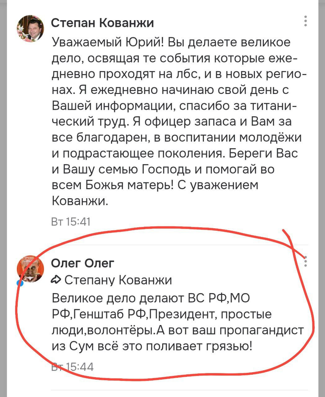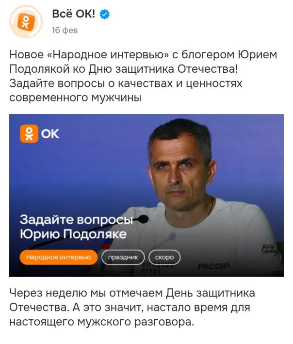 Тут, оказывается, у ОКов приключилось внезапное и они в честь 23 февраля не нашли никого получше, чем банный Юрок из Сум. Да-да, тот самый, который уже поздравлял нас фотографиями хохлоармии. С 23 февраля поздравлял, с Днём десантника. Почему-то фотками ВСУшников. И предложили ему задавать вопросы. И люди таки начали задавать. В том числе, и адекватные, но неприятные.