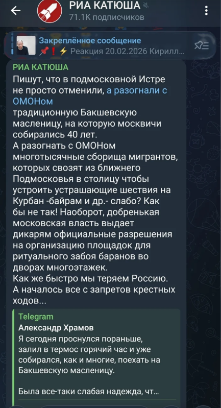 В городском округе Истра отменили Бакшевскую Масляницу — поляну, где должен был пройти праздник, оцепил ОМОН. Об этом пишет издание «Подмосква». К месту также пришли представители движения Сорок сороков, заявившие, что не допустят проведения «языческого праздника».
