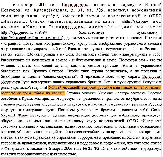 «Я Призываю всех кому дорога Белорусско-Украинська Русь поддержать наших Украинских братьев! Бери в руки оружие! Вступае в ряды украинской гвардии! Убивай москалей! Устроим русским наемникам ад на их земле - взорвём их дома, убьем их семьи!», - эти слова выделены в приговоре как призыв к террору.