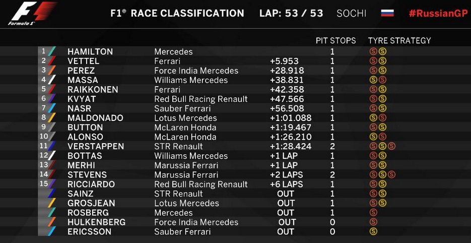 Кроме этого, интрига в гонке сохранялась до самого последнего круга, который выдался достаточно нервным, как для гонщиков, так и для зрителей. Один из наиболее перспективных пилотов Королевских гонок финн Валттери Боттас вынырнул перед болидом мексиканца Серхио Переса и улыбнулся: до подиума в Сочи осталось меньше круга. Но через мгновение он видит в зеркалах заднего вида Ferrari своего земляка Кими Райккёнена. И через три секунды в очередной борьбе за третье место белый и красный болиды, сцепившись, вылетают за пределы «Сочи Автодрома», а уже было расстроившийся Перес, празднует попадание на подиум этапа в Сочи.