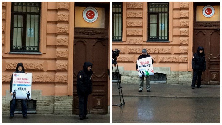 Простить можно многое, еще больше можно понять. Но предательство… Нет, предательство не прощают. Неспроста имя Иуды стало нарицательным и одинаково мерзко звучит на всех языках. Посольства Турции сегодня сопровождают акции протеста тоже во многих странах мира. В том числе и в Санкт-Петербурге. Но вопрошаем ли мы – «И ты Брут?», обращаясь к туркам, сбивших наш Су-24? Нет, мы привыкли, мы знаем, что у России настоящих союзников только два – армия и флот, да теперь еще и ВКС. На наших лицах не удивление, но гнев. Я не смог упустить возможности и отправился посмотреть на одиночный пикет, организованный возле консульства Турции партией «Родина» в лице Юрия Любомирского.