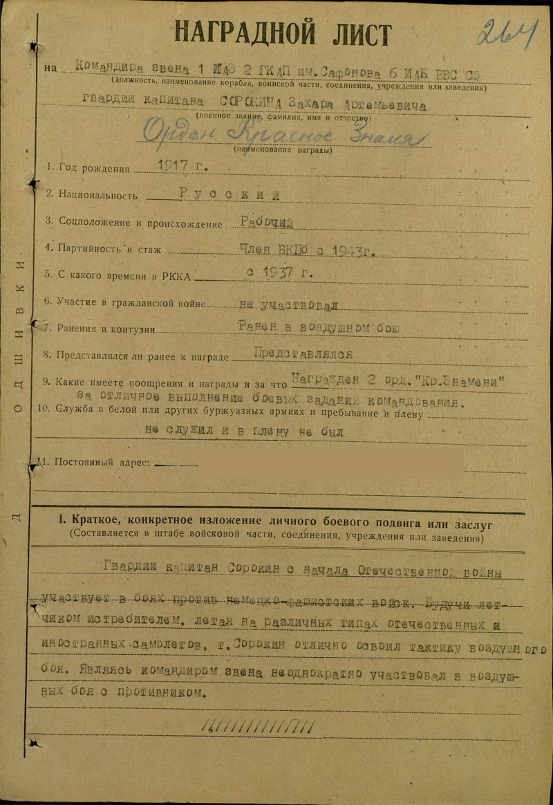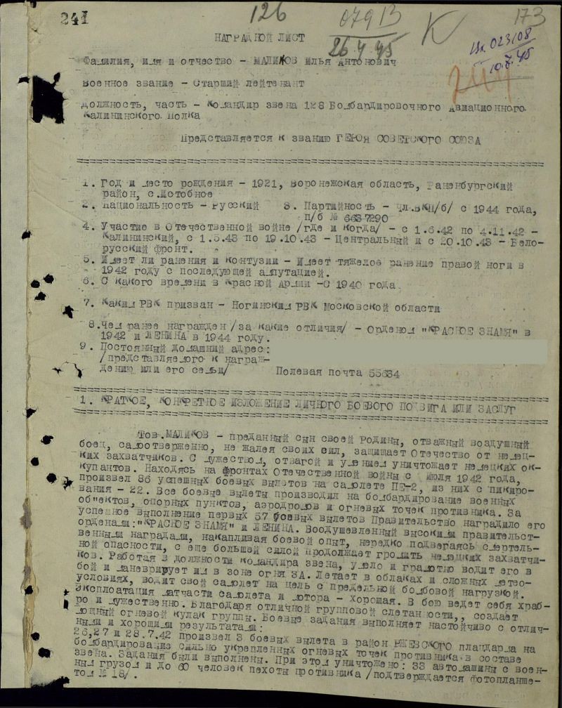 За 86 успешно совершённых боевых вылета, из них 22 с пикирования, несмотря на протез, за мужество, отвагу и героизм, проявленные в боях с немецко-фашистским захватчиками, за мастерство и умение бить врага достоин звания Героя Советского Союза», — говорится в наградном листе, подписанном Героем Советского Союза Воронковым, командиром 128-го бомбардировочного авиационного Калининского полка.