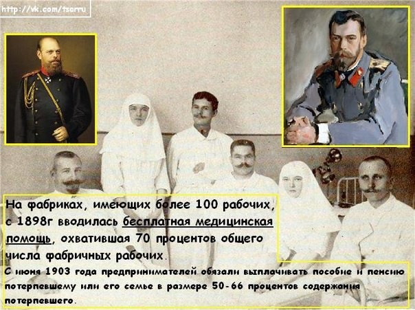 По тому времени Императорское социальное законодательство было несомненно самым прогрессивным в мире. Это заставило Тафта, тогдашнего Президента США, за два года до 1-ой Мировой войны публично заявить, в присутствии нескольких русских высокопоставленных лиц: «Ваш Император создал такое совершенное рабочее законодательство, каким ни одно демократическое государство похвастаться не может».