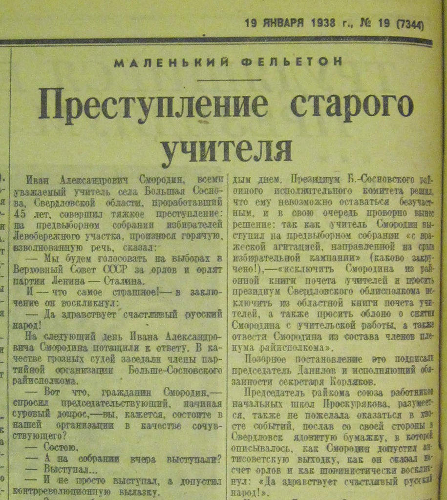 «Иван Александрович Смородин, всеми уважаемый учитель села Большая Соснова, Свердловской области, проработавший 45 лет, совершил тяжкое поступление: на предвыборном собрании избирателей Левобережного участка, произнося горячую, взволнованную речь, сказал: