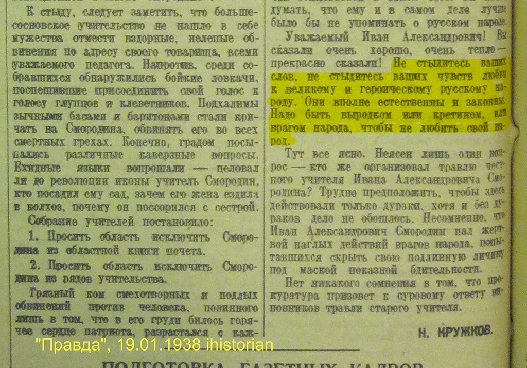 Передо мной газета «Правда» от 19 января 1938 года. Фельетон Н.Кружкова «Преступление старого учителя» современному человеку кажется настолько диким и фантастичным, что в голове не укладывается простая мысль: «А все так и было!».
