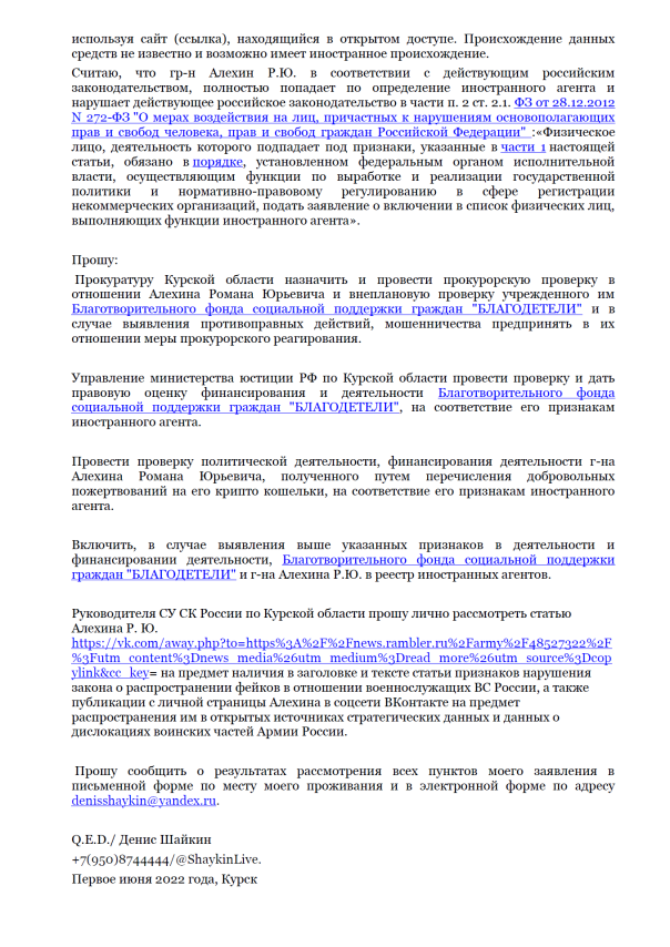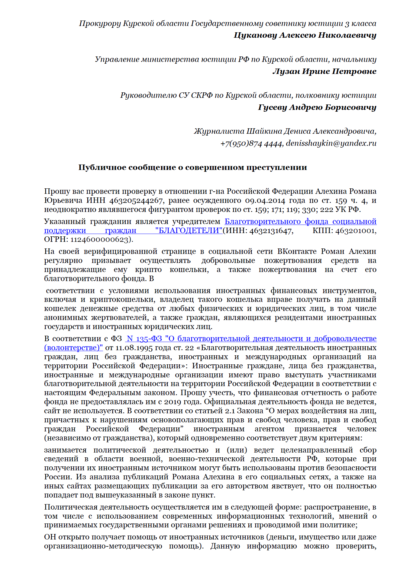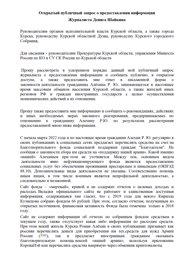 Открытый публичный запрос о предоставлении информации Журналиста Дениса Шайкина