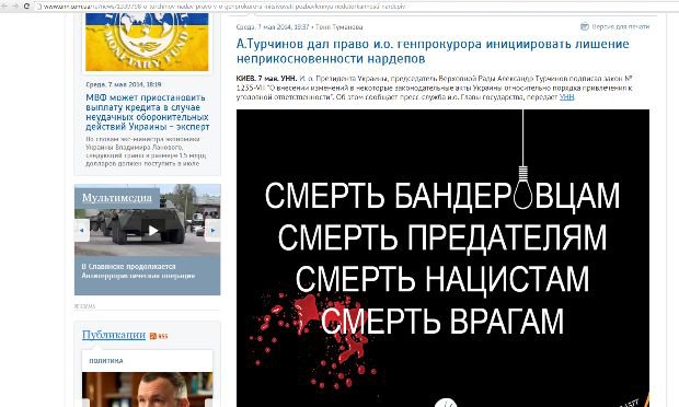 Сайт украинского информационного агентства УНН в среду, 7 мая, подвергся атаке хакеров. В ряде новостей при их открытии на момент написания данной заметки появлялось похожее на плакат изображение, на котором на черном фоне написано: «Смерть бандеровцам, смерть предателям, смерть нацистам, смерть врагам».