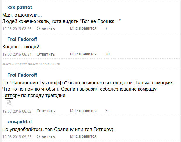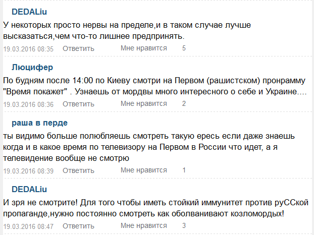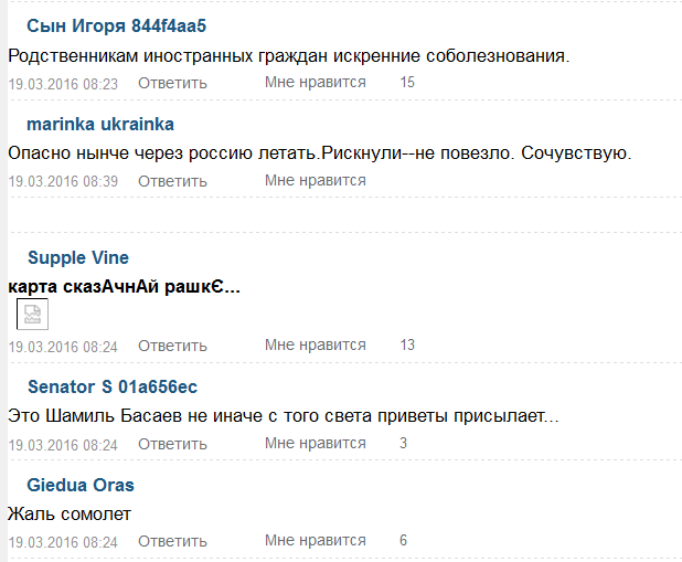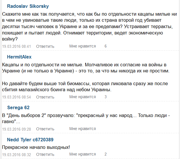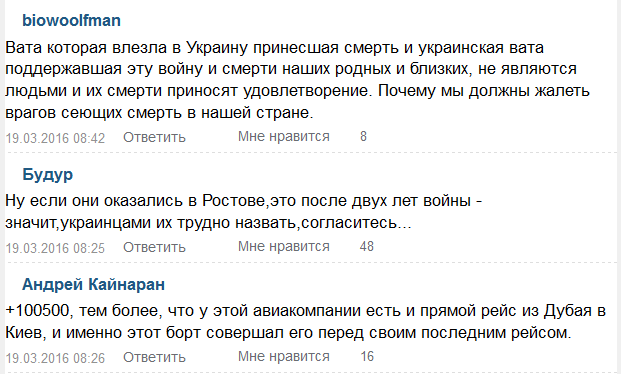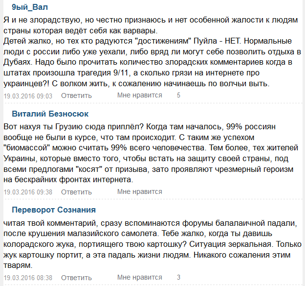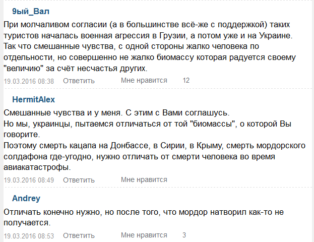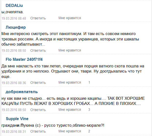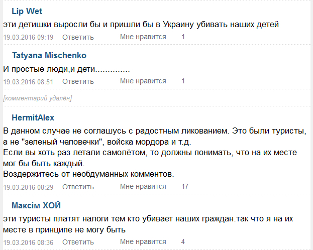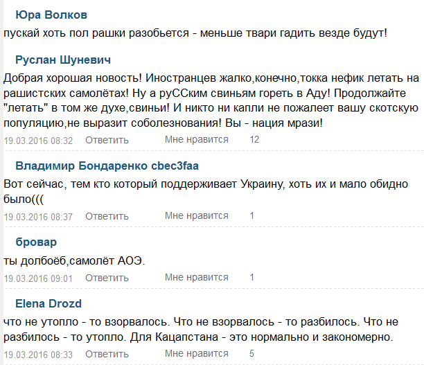 Ниже - комментарии пользователей украинских сайтов. Есть и вменяемые, призывающие не злословить по поводу смертей безвиннных людей, однако это редкость, ибо современное украинское большинство в своей массе откровенное быдло, трусливое и поганое, как блудливые шакалы, роющиеся в поисках съедобного гнилья на помойке Евросоюза....