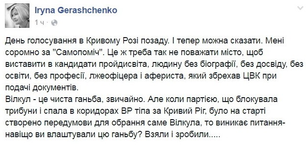 Вилкул — это чистый позор, конечно. Но когда партия, блокировала трибуны и спала в коридорах ВР типа за Кривой Рог, были на старте созданы предпосылки для избрания именно Вилкула, то возникает вопрос- зачем вы устроили этот позор? Взяли и сделали …..», — возмущается Геращенко.