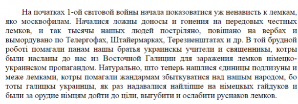 Конфликт внутри лемковского общества особенно обострился в Первую Мировую и в Великую Отечественную войны. Лемки-украиноманы поддерживали и в 1914, и в 1941 гг. австрийцев и немцев. 1914 и 1941 гг. — время первых «евромайданов», когда евроинтеграторы-украиноманы выполняли такую же функцию, что и сегодня.