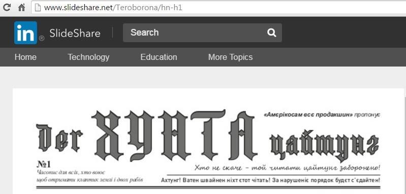 Журналист также публикует скриншот газетной «шапки» пропагандистского издания для украинскитх военных. Название газеты выполнено готическим шрифтом, копирующим название газет в Третьем Рейхе. А артикль der перед украинским «хунта», отсілает к печальноизвестному погромному изданию «Der Stürmer», издававшемуся осужденным в Нюрнберге нацистским преступником Юлиусом Штрайхером.
